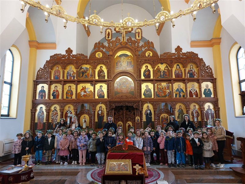 Дјеца су цјеливала иконе, даровала новчић и пришла на благослов, а потом отпјевала неколико пригодних пјесмица које су припремили са професором Недељком Kусићем.