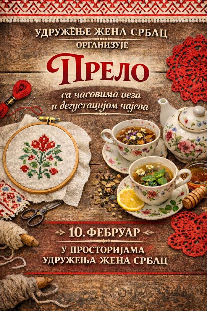 Удружење жена Србац у уторак, 10. фебруара, са почетком у 18 часова, организује Прело у оквиру којег ће бити одржани часови веза које ће водити искусне везиље Гордана Ђаковић, Брана Лончар, Санда Цвијић и Мира Јовичић.